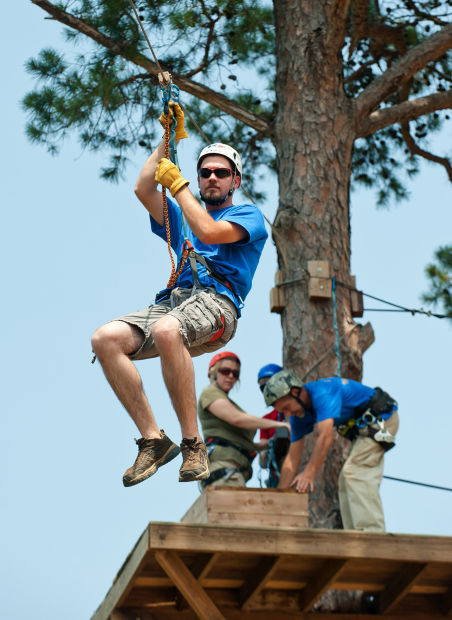 Sawyer rafts, broken bridge, barrel cross, lake rope cross, volleyball court, pavilion games, and net climb land